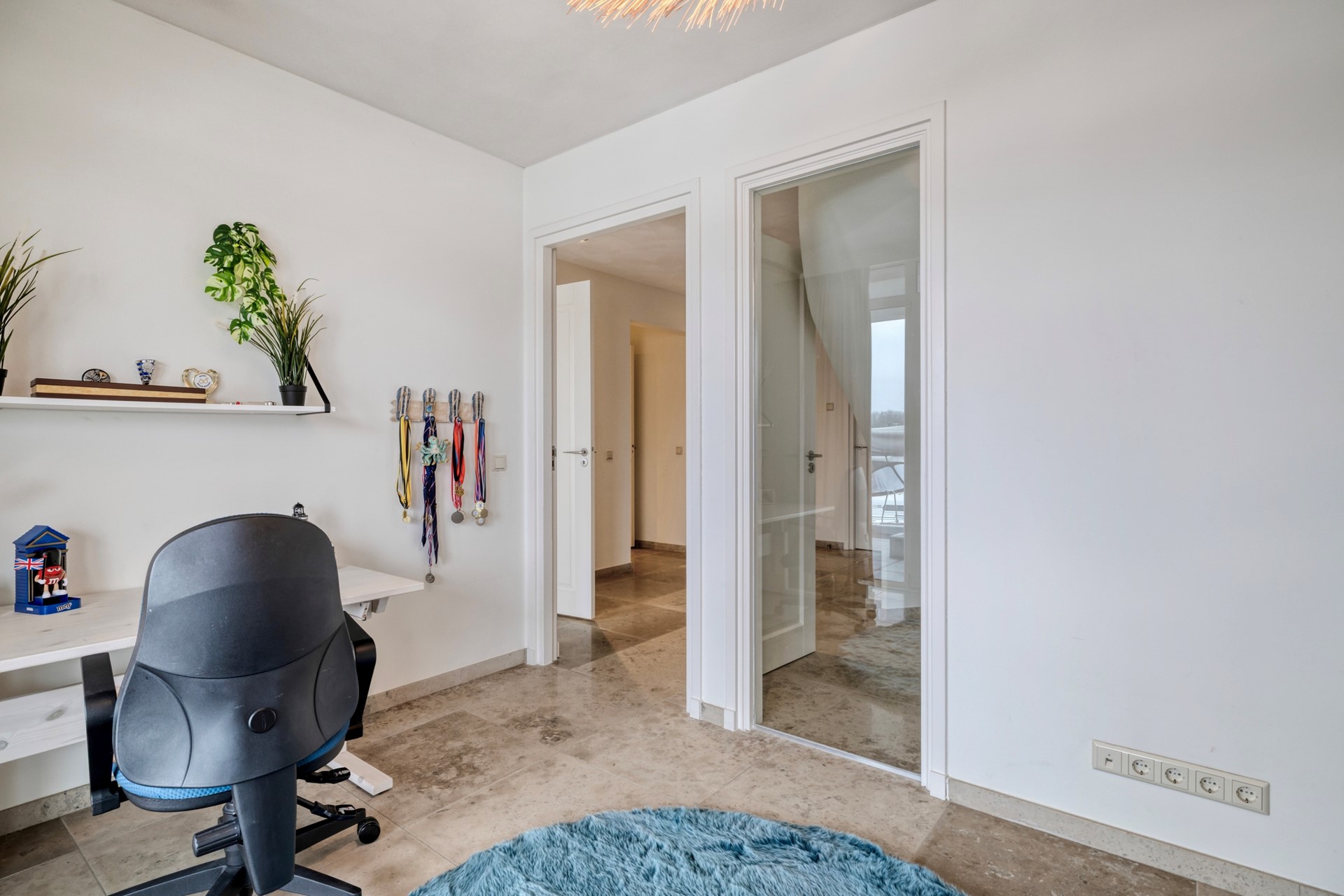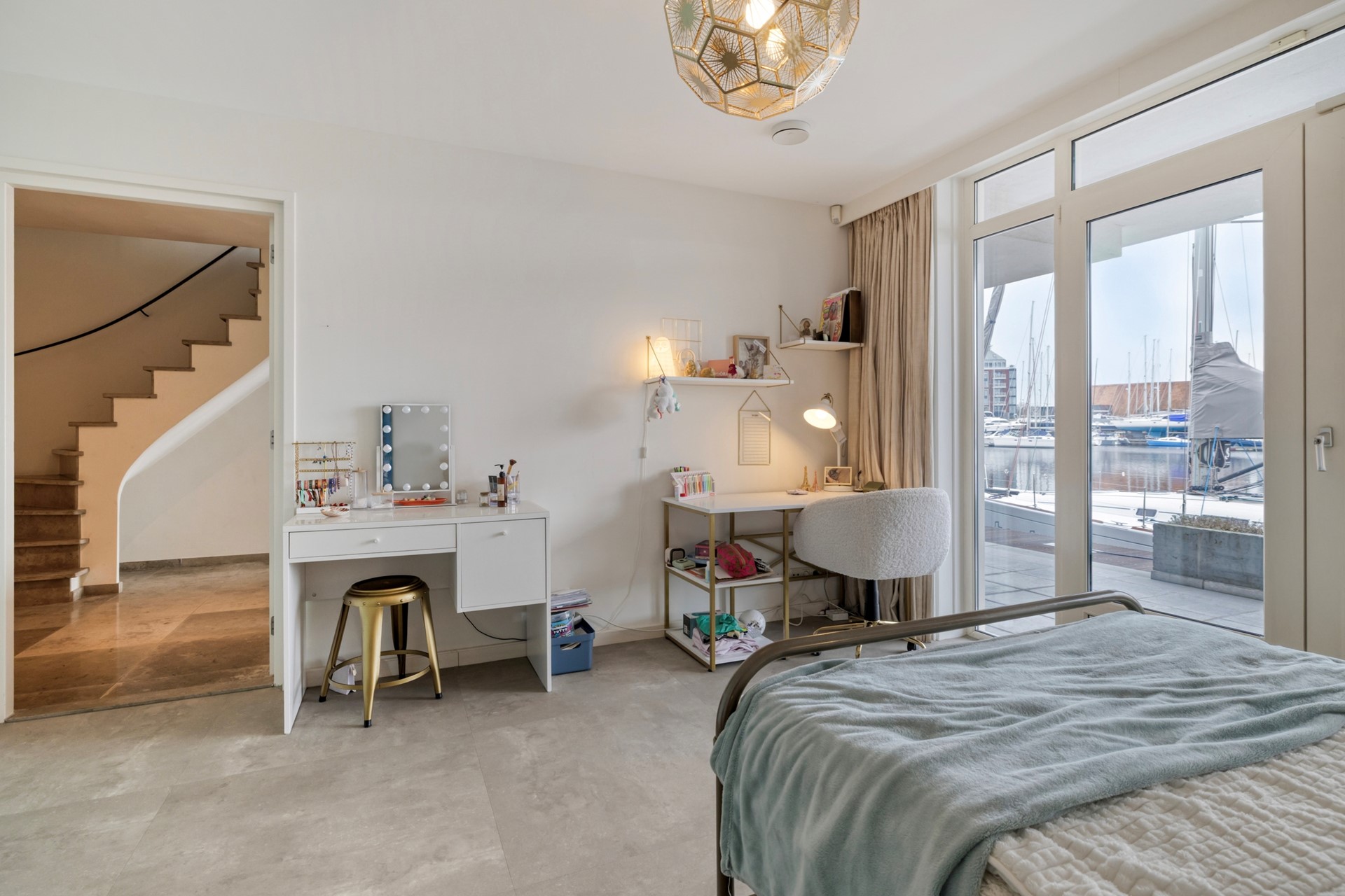 Slaapkamer 2 is afgewerkt met een marmeren vloer, gestucte wanden en plafond. De slaapkamer biedt toegang tot de steiger middels openslaande tuindeur voorzien plissé hor.