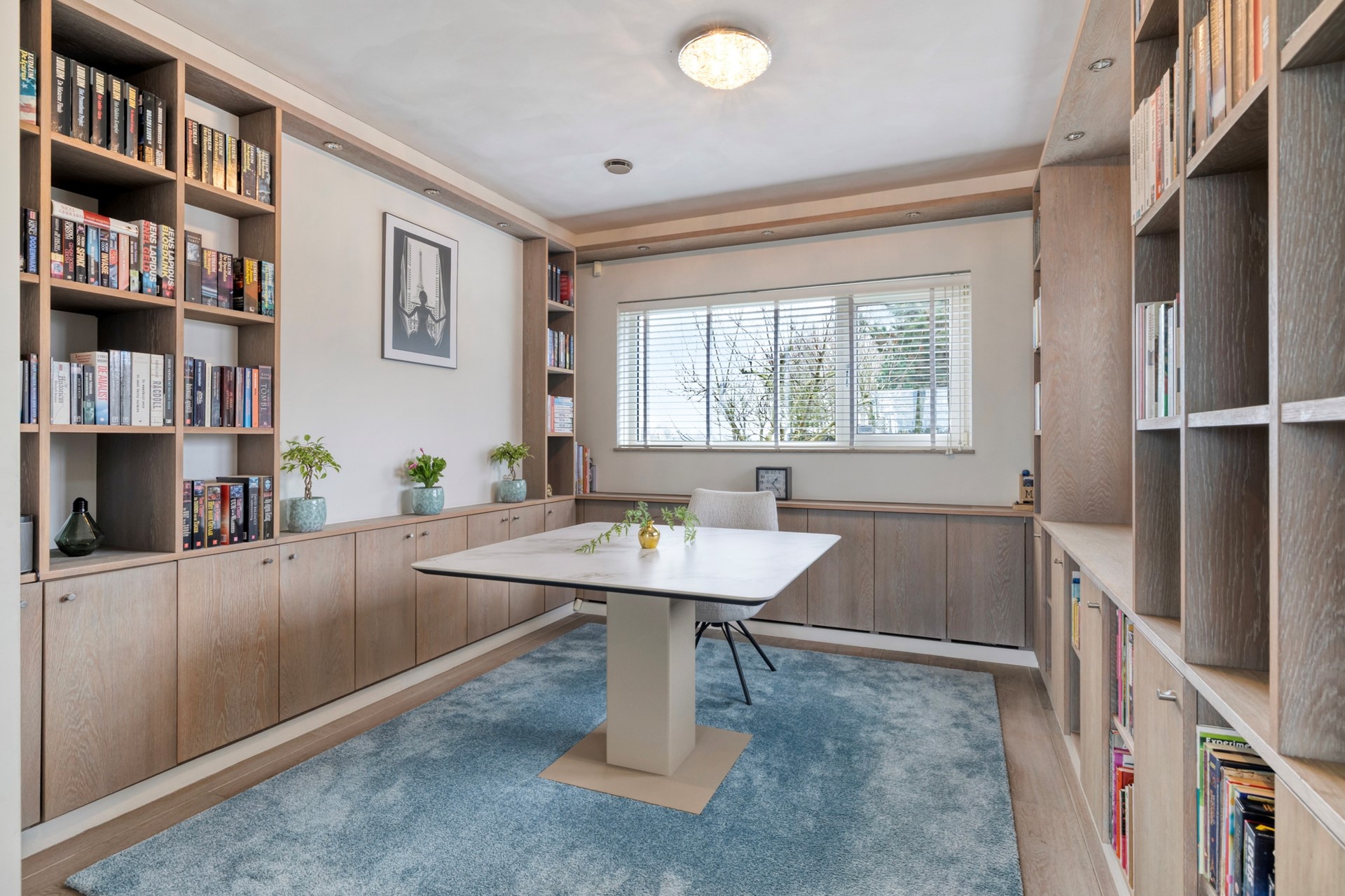 De kantoorruimte is afgewerkt met een houten vloer, gestucte wanden en een gestuct plafond. De kantoorruimte is voorzien van inbouwverlichting en op maat gemaakte kasten.