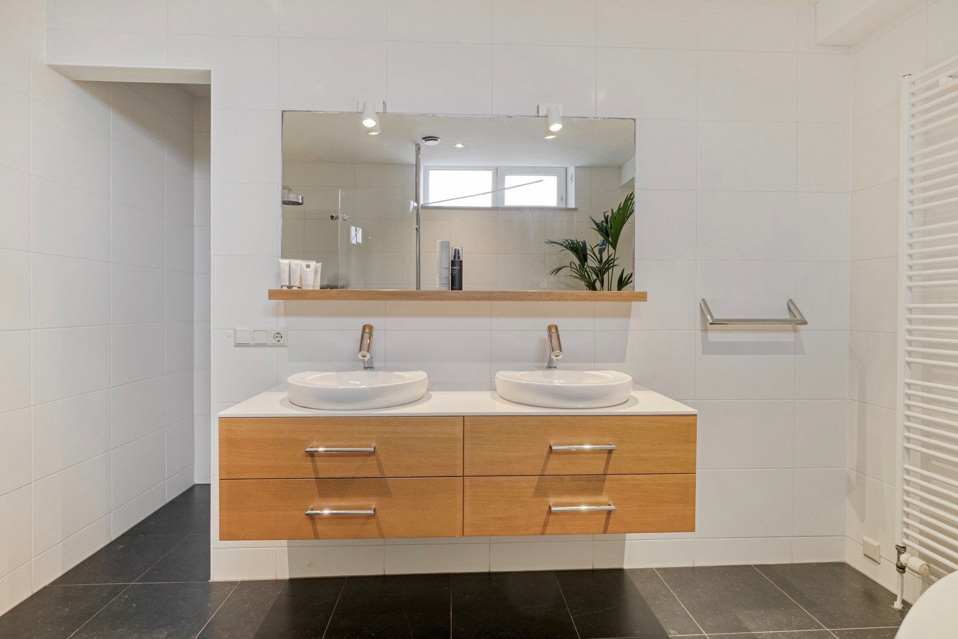 Wauw, wat een eyecatcher! Luxe en stijl komen perfect samen in deze oogverblindende badkamer ensuite. De moderne badkamer is afgewerkt met een betegelde vloer met vloerverwarming, betegelde wanden en een stucwerk plafond. De badkamer is voorzien van een toilet, vrijstaand bad, inloopdouche, dubbel wastafelmeubel, design radiator en mechanische ventilatie.