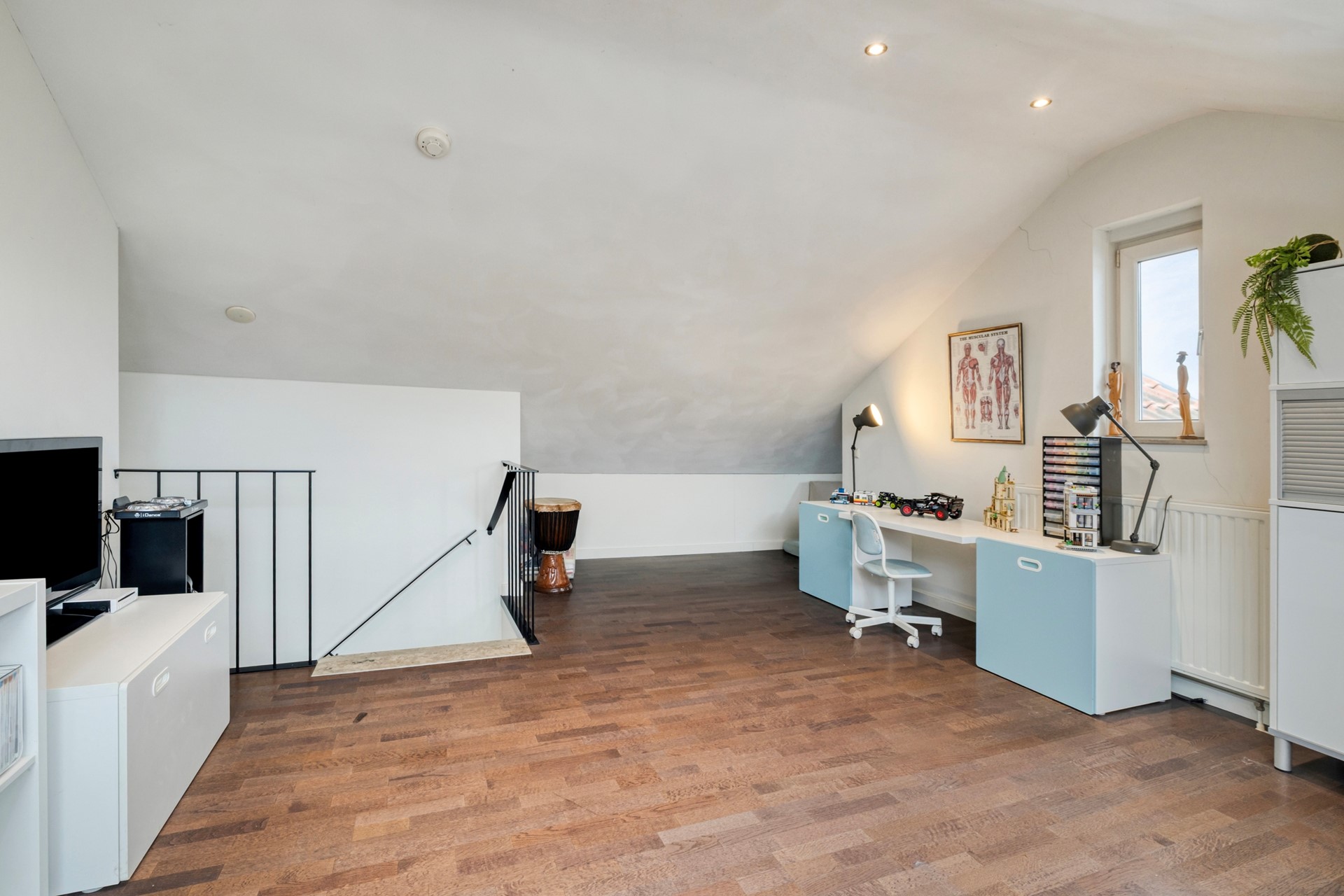 Middels de vaste trap op de begane grond bereiken jullie de slaapkamer op de eerste verdieping. De riante slaapkamer is afgewerkt met een laminaat vloer, gestucte wanden en een gestuct plafond. Deze slaapkamer is voorzien van een wastafelmeubel en 2 Velux dakramen. Tevens bevat deze verdieping veel bergruimte waar men het WTW systeem en de domotica kan vinden.